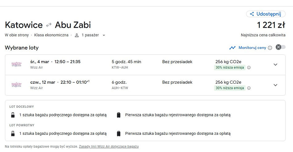 -Biletu lotniczego na trasie Kraków - Abu Zabi (~1000–1500 zł w dwie strony, bagaż rejestrowany płatny dodatkowo) – pomagamy w zakupie